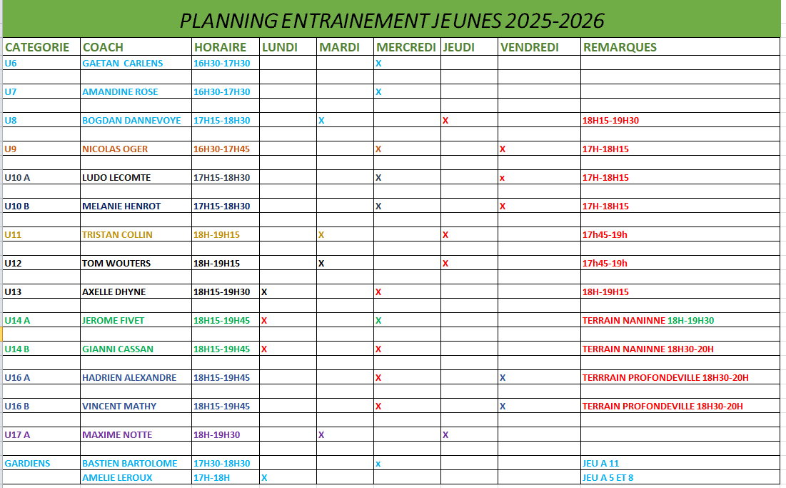 Horaire entraînements