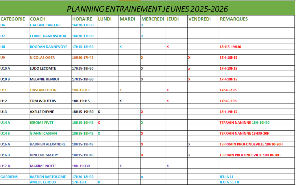 Horaire entraînements